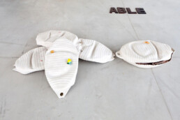 For her new, specially commissioned installation at der TANK, Raffaela has created a distilled version of all these impressions we receive from life. There is a sculpture-skin and a sculpture-roof and a text-window and a sound-music… All of them inhabit a concrete cube, which serves as both an exhibition space and a sculpture workshop. It is for this matter that she chose these elements, the elements that she did in her workshop, at home and transported them here, to der TANK—a space that promises a certain neutrality, because of its square form and the transparency of the glass, but is actually no less than a roof, a shelter, a home to all the sculptures being made here. It is as if Raffaela wanted to tell der TANK about all the lemons in the world, about the memories that spaces possess and how the memories of her house, herself, her city merge with the memories of a space that seems “outside” of tradition, casted by architects in a new part of the city of Basel. But also, how moving to be able to be touched by all the artworks and the people. At times, we accept the space as a test site; at others, as an exhibition space.